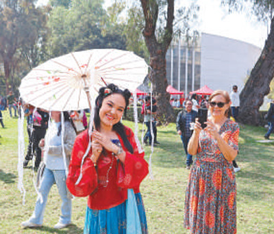 在墨西哥第四届中国新年文化节上,当地青年身着中国传统服饰留影纪念。人民日报墨西哥分社 埃内斯托·多明戈斯摄