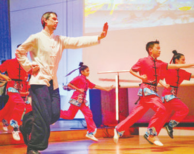 在2025年柏林及勃兰登堡中国留学生蛇年春节联欢晚会上,当地学生表演武术节目《中国武魂》。人民日报记者 刘 赫摄